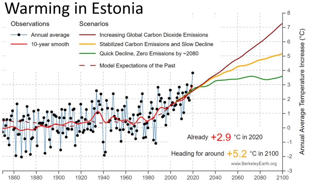 Milline tulevik meid ootab ja kuidas elab 200-aastane Eesti? Kliimamuutus on Eestile väga tõsine oht ja mitte vaid sellepärast, et praeguste poliitikate jätkumisel on aastaks 2100 Eesti keskmine temperatuur tõusnud 5.2 kraadi võrra võrreldes eelmise sajandi algusega, vaid seetõttu, et samaaegne maailma keskmise temperatuuri tõus 3-4 kraadi võrra toob kaasa suured inimese eluks kõlbmatud piirkonnad täna väga tihedalt asustatud aladel.