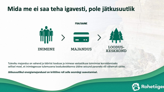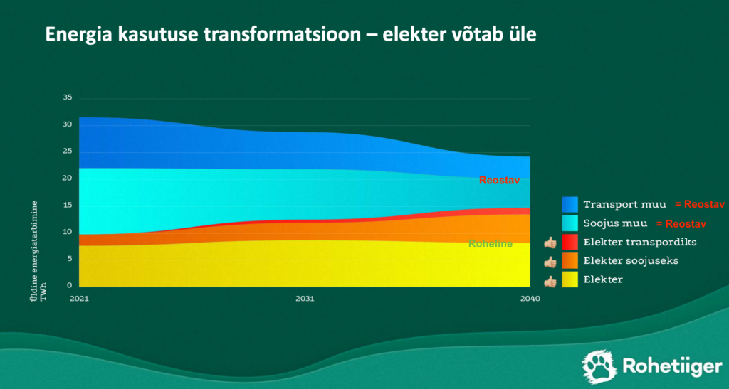 Vaatame järgmist slaidi Rohetiigrist, mis võtab kokku energiakasutuse: nagu näete Rohetiigi teekaardi puhta energia osa suureneb vaid umbes 1/3 võrra ja ligi pool energiast jääb ka aastal 2040 “muu” kategooriasse, ehk mis ei ole elektri kaudu ja on ühel või teisil saastav ja/või loodust koormav. Siin tasub küsida, kui roheline on selline teekaart?