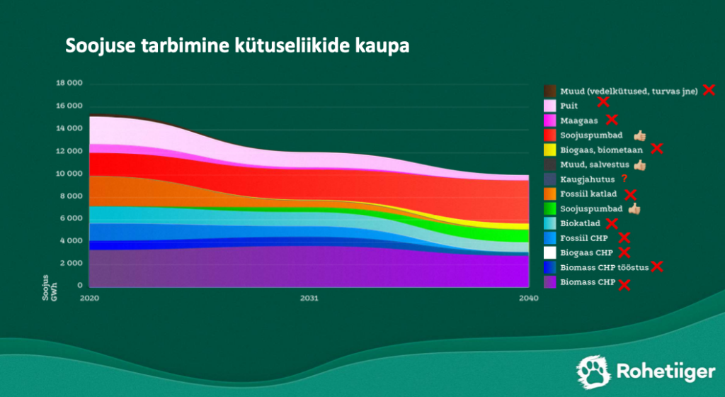 Toon siin kokkuvõtvad Rohetiigri slaidid, milline on tulevik nende plaani järgi. Oma kommentaaridega olen klassifitseerinud positiivsed 👍🏼 ja reostavad ❌ energiaallikad. CHP peaks siin tähistama koostootmisjaama. Ma oletan, et soojuspumpade osas on mõeldud eraldi tööstuslikke ja tarbijate omi, ja need on tõesti vajalikud puhtad soojusenergia allikad. Mitte-jätkusuutlike kütuseliikide tarbimise plaan on hirmuäratavalt suur.