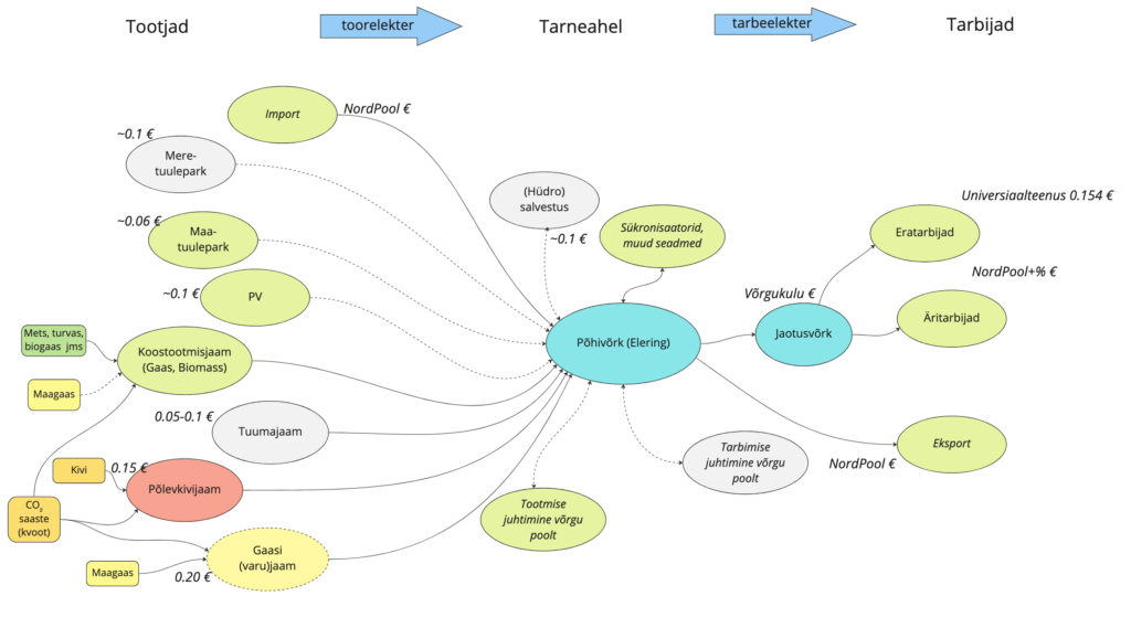Kokkuvõtteks meie elektrivõrgu lihtsustatud joonis umbkaudsete hindadega erinevates tarneahela osades.